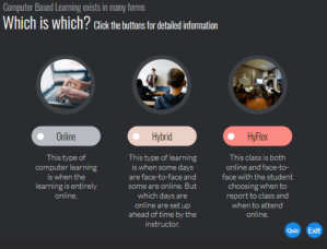 The situation was the staff were having trouble differentiating the types of courses offered. Sometimes they would confuse terminology and this confused the students’ expectations of the courses. A fast and asynchronous solution had to be developed to correct the terminology use and get everyone on the same page when meeting. This fully online micro-lesson designed in Storyline distributed the information and assessed the users understanding. Using the buttons, users could explore the differences of fully online design considerations, hybrid learning considerations, and hyflex learning and design considerations. This micro course designed in Articulate Storyline uses graphical images to define and differentiate various online training modalities.